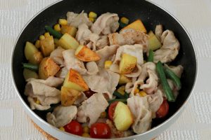 じゃがいもに火が通ったら、いんげん、コーン、ミニトマト、カレー粉を加え、塩・胡椒で味を調える。
