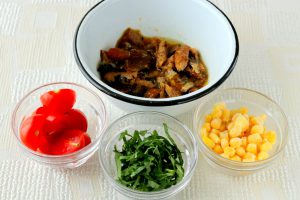 ミニトマトはへたを取り半分に切り、大葉は千切りにする。いわし缶は身を粗くほぐし缶汁と合わせる。
