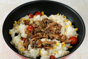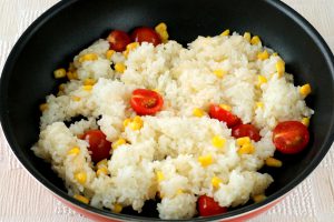 フライパンにごま油を入れ中火にかけ、ごはん、ミニトマト、コーンの順に加え炒める。
