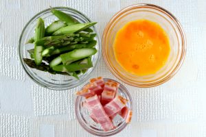 アスパラガスは斜め切りにする。ベーコンは1㎝幅に切り、卵はボウルに割り溶いておく。
