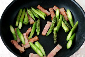 フライパンにオリーブ油とベーコンを入れ中火にかけ、ベーコンから油が出てきたらアスパラガスを加え炒める。