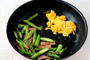 アスパラガスに火が通ったら、具材を端に寄せ、余ったスペースに卵を流し入れいり卵を作る。