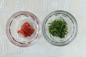 梅干しは種を取り包丁でたたき、大葉は千切りにする。