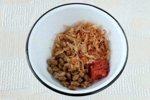 納豆、梅肉、かつお節を混ぜ合わせ、最後に大葉を加え混ぜる。