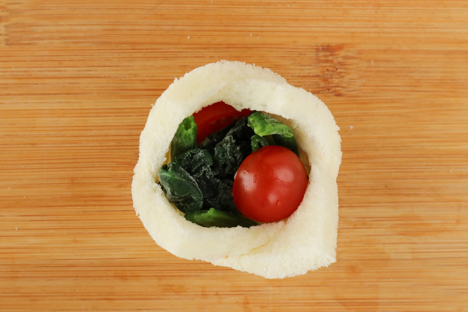 半分に切ったトマトとほうれん草を入れ、チーズを乗せる。