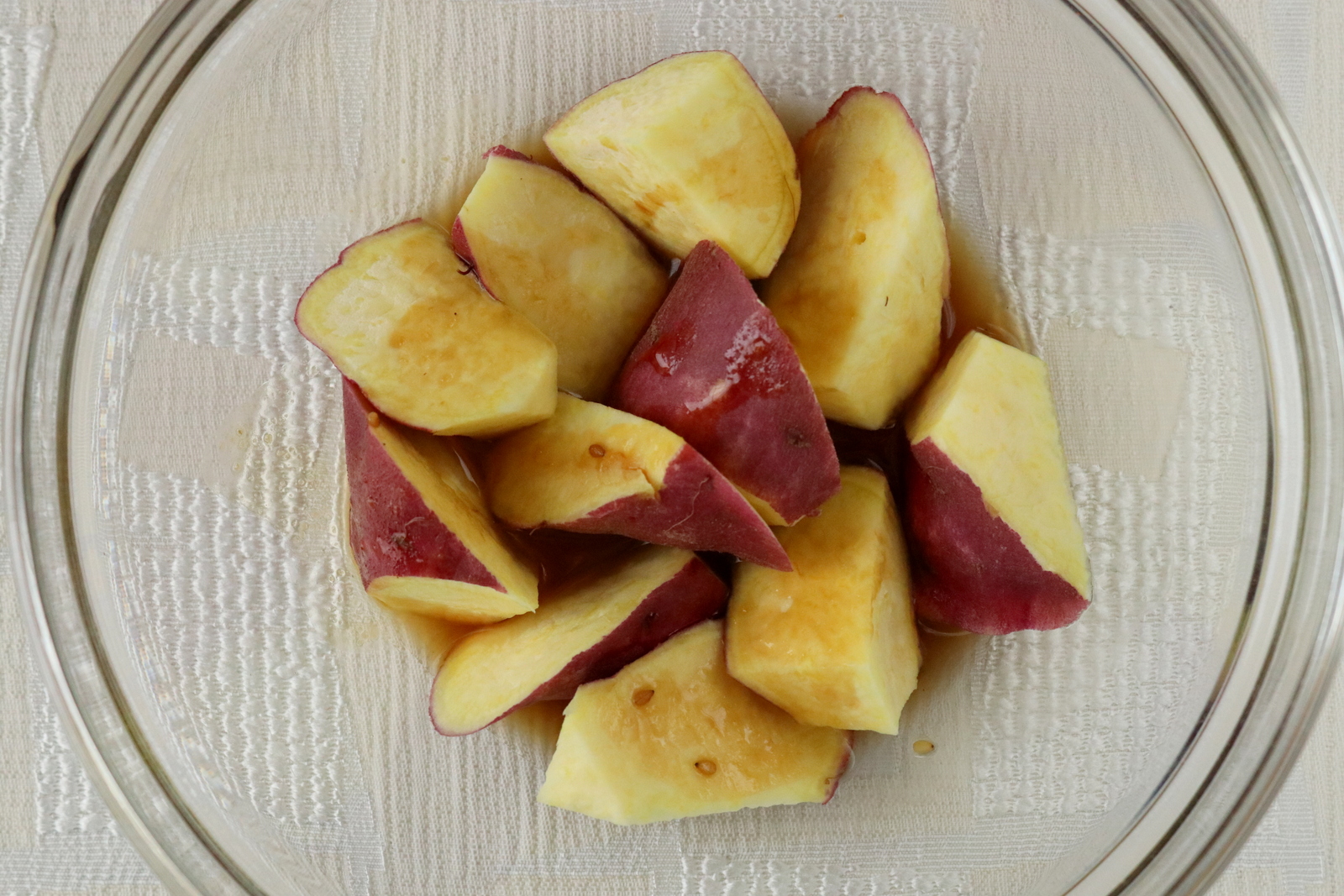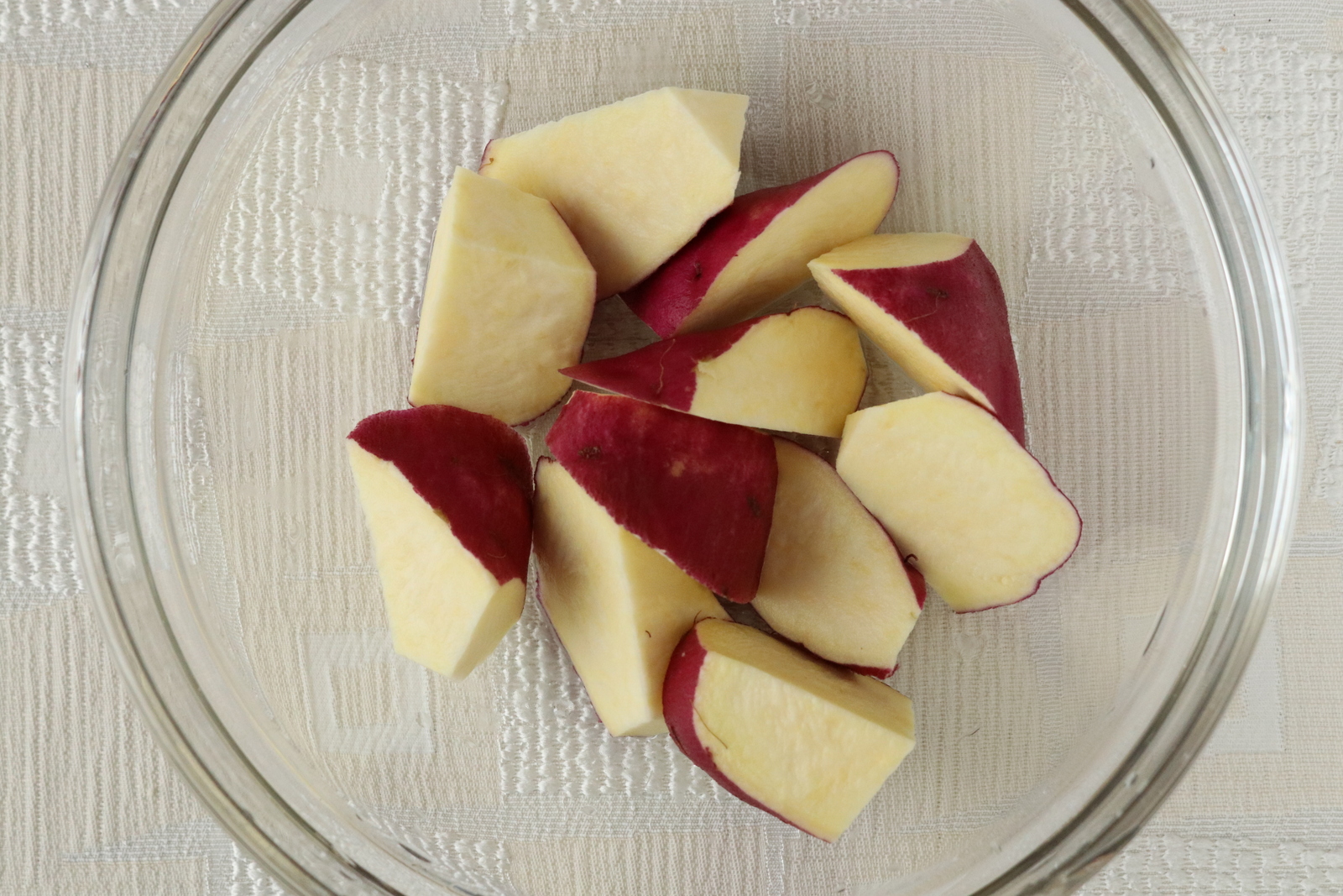 さつまいもは乱切りにして水にくぐらせる。