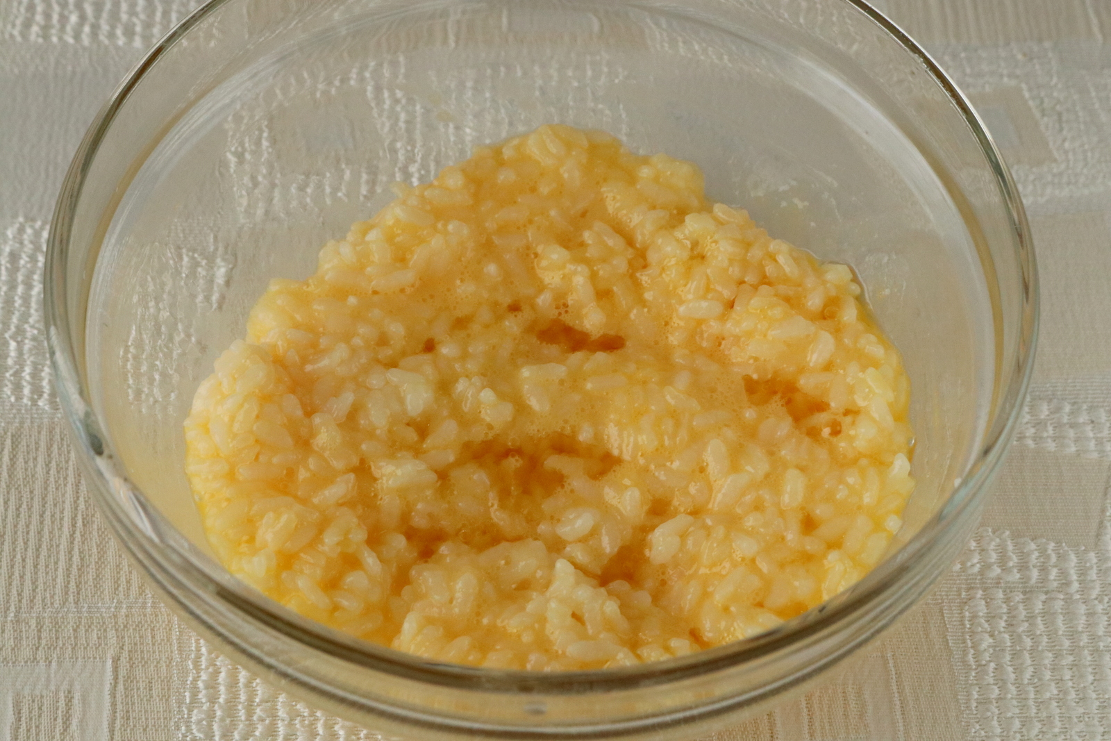 耐熱ボウルに卵を割りほぐし、ごはんとごま油を入れ混ぜ合わせる。