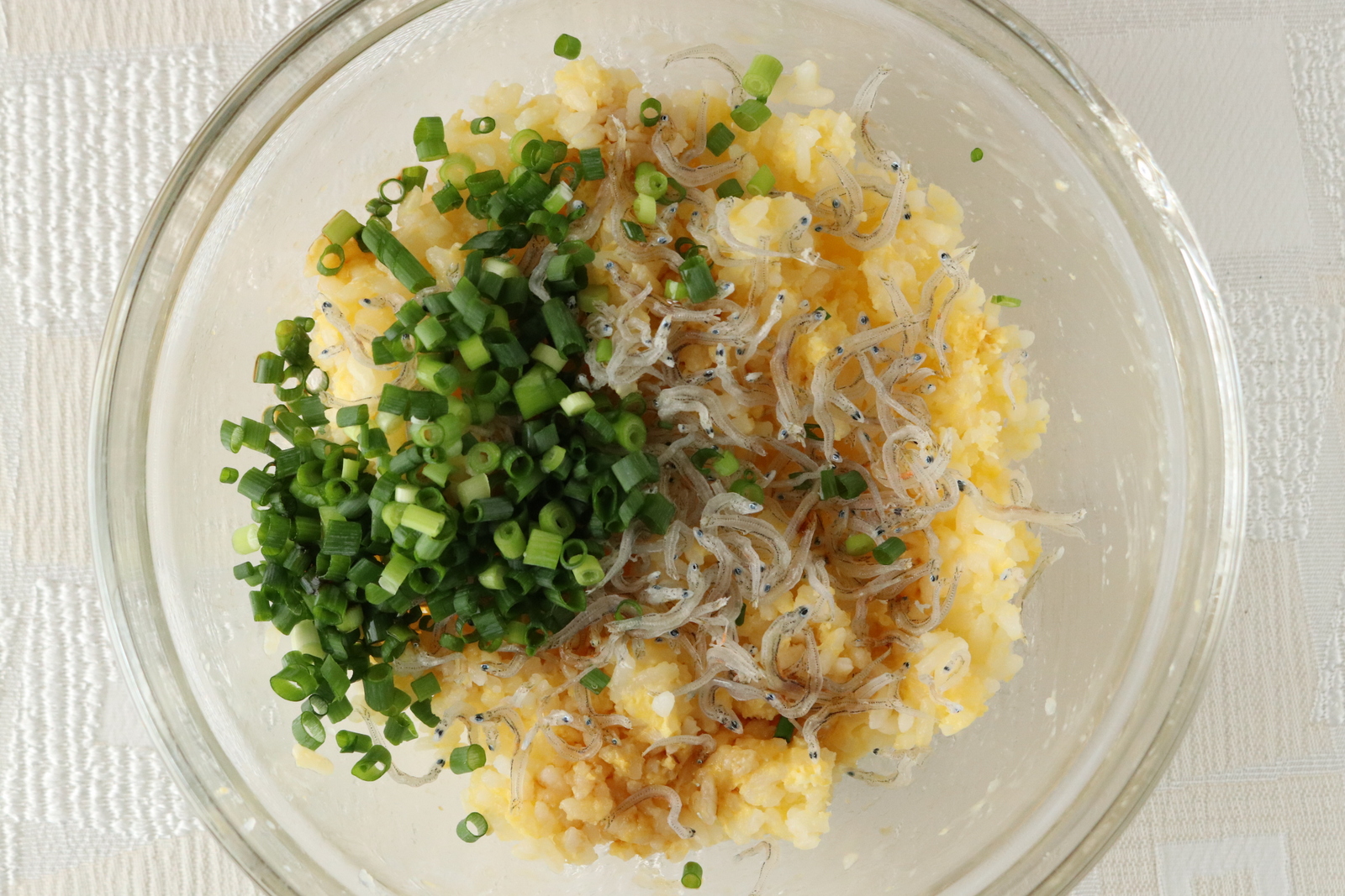 ちりめんじゃこ、小口に切ったこねぎ、醤油を加え混ぜ、さらに1分加熱する。