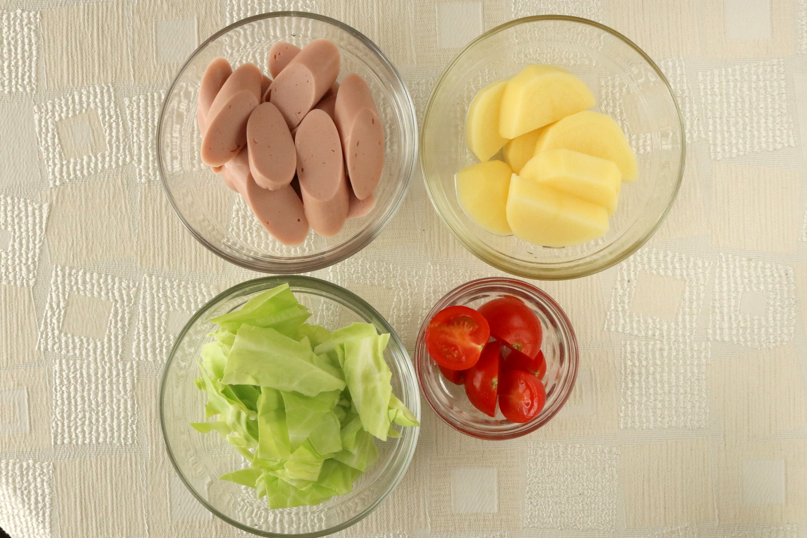 魚肉ソーセージは斜め切り、じゃがいもは皮をむいて1㎝厚、キャベツはざく切り、ミニトマトはヘタを取り半分に切る。