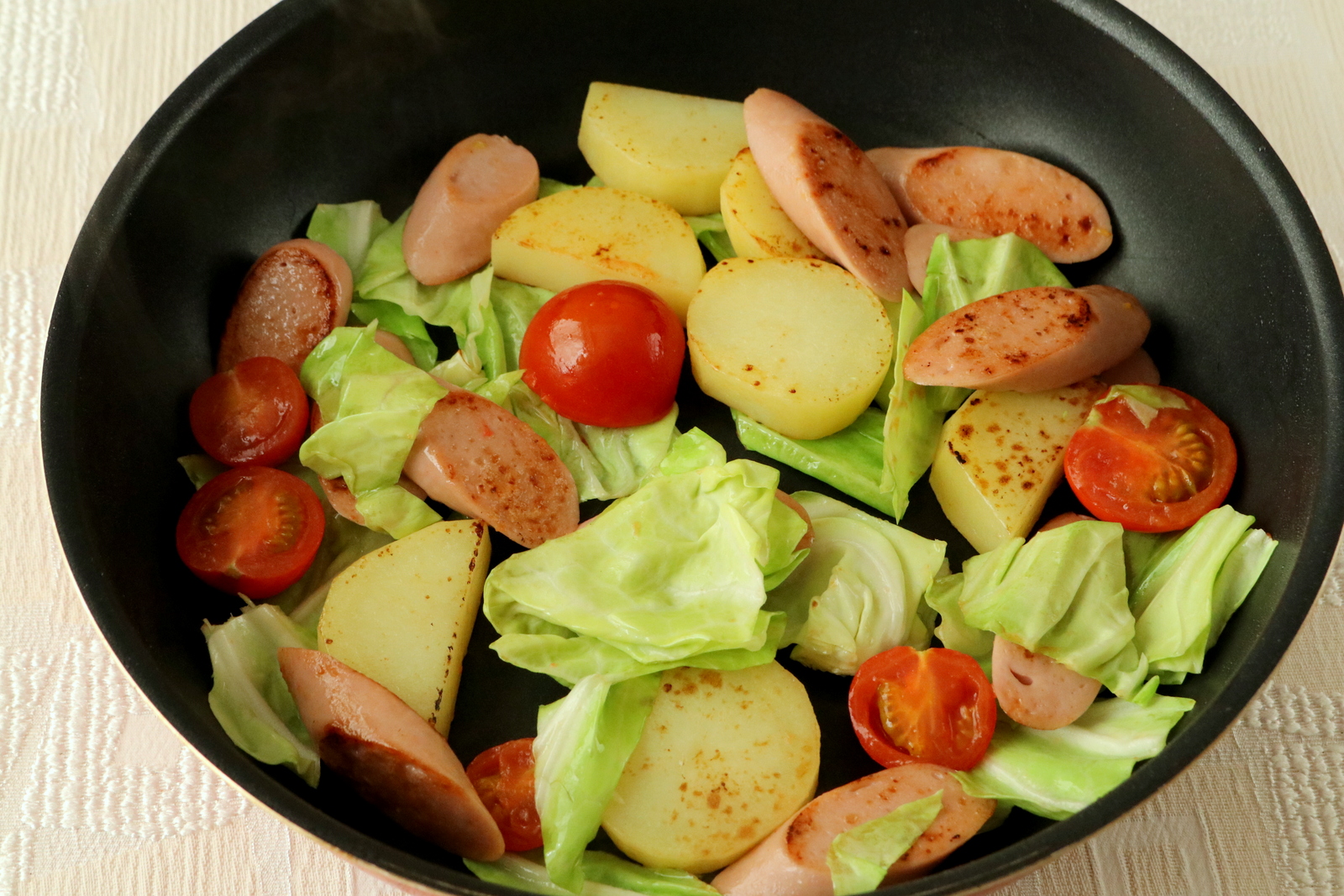 じゃがいもに火が通ったらキャベツとミニトマトを入れさらに炒める。