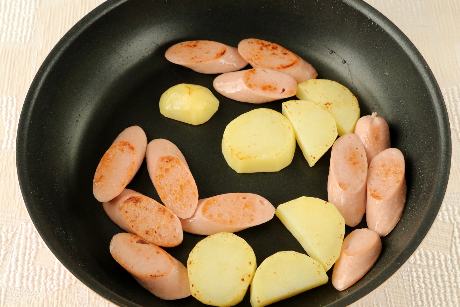 フライパンにオリーブ油を入れ中火にかけ、魚肉ソーセージとじゃがいもを炒める