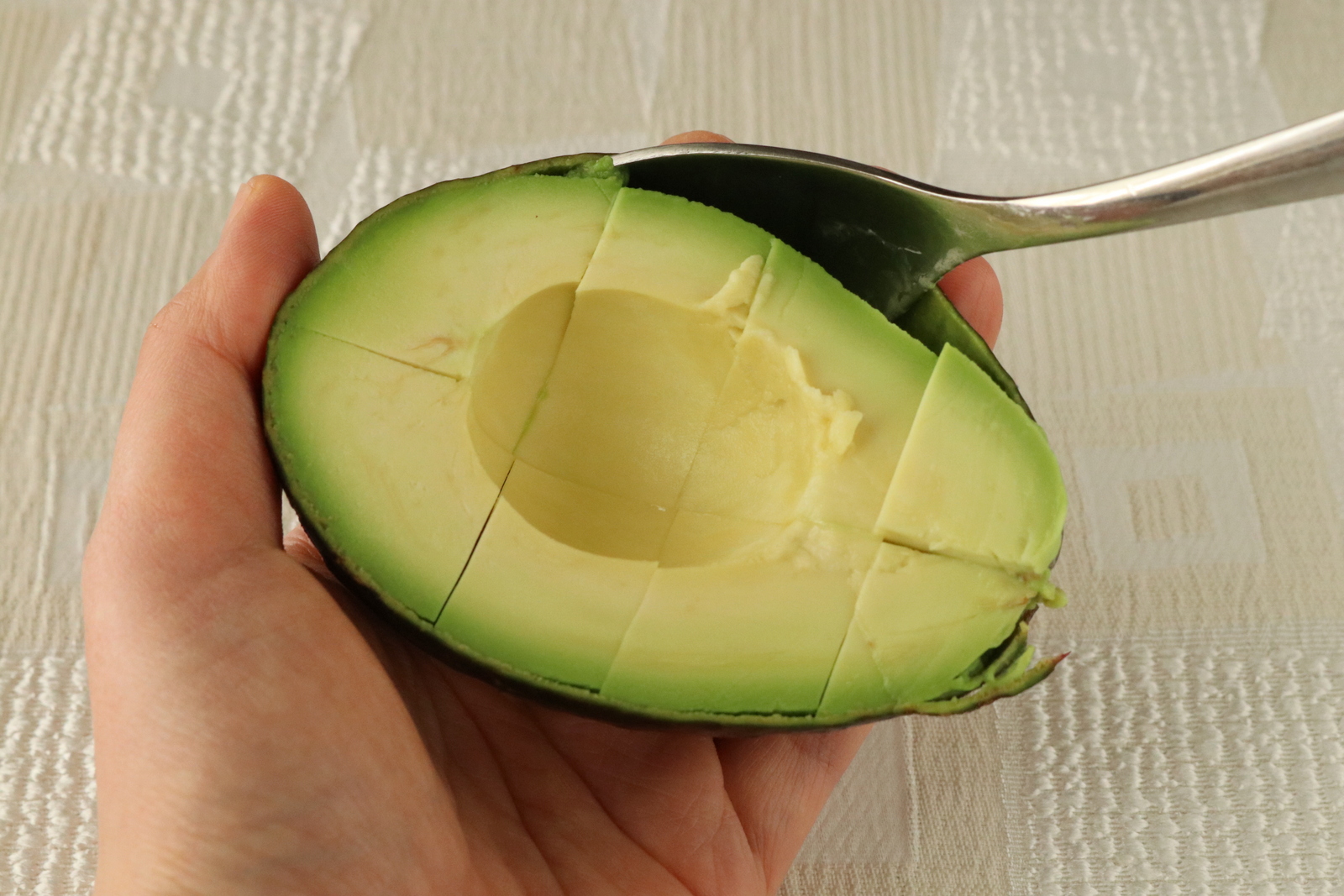 アボカドは半分に切って種をとり、ひと口大に切れ目を入れてスプーンですくうようにして取り出す。