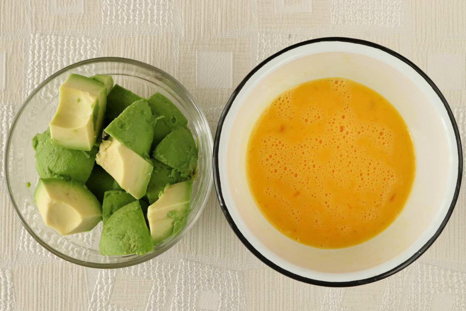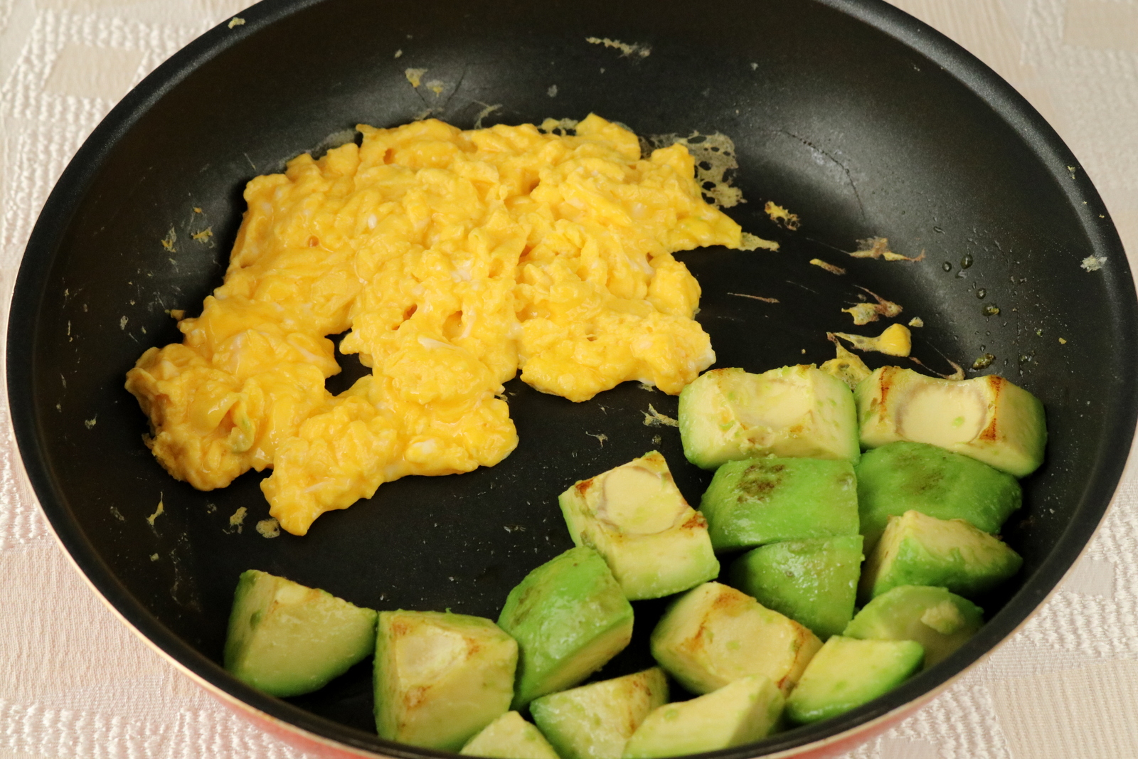 フライパンにオリーブ油を入れ中火にかけ、アボカドを炒めアボカドの表面に焼き色がついたら端に寄せ、卵を流し入れスクランブルエッグを作る。,