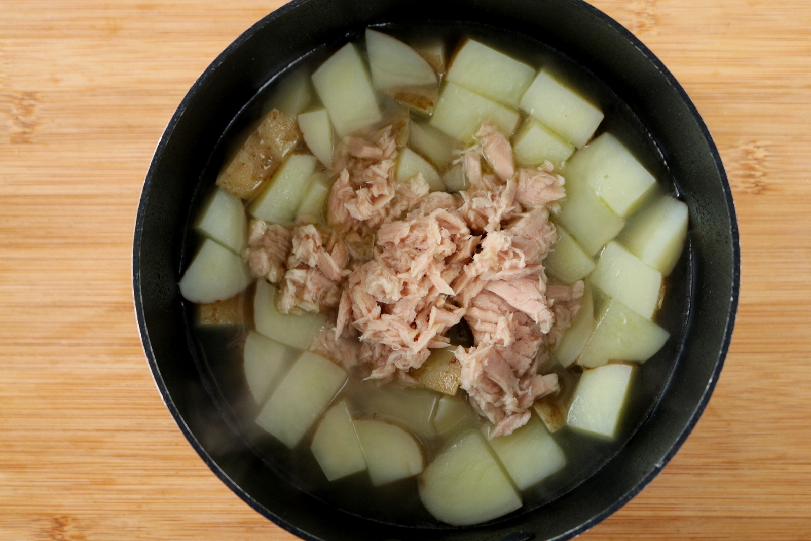 じゃがいもが柔らかくなったらツナを加え、味噌を溶かし入れ、豆乳を加え沸騰しないように温める。