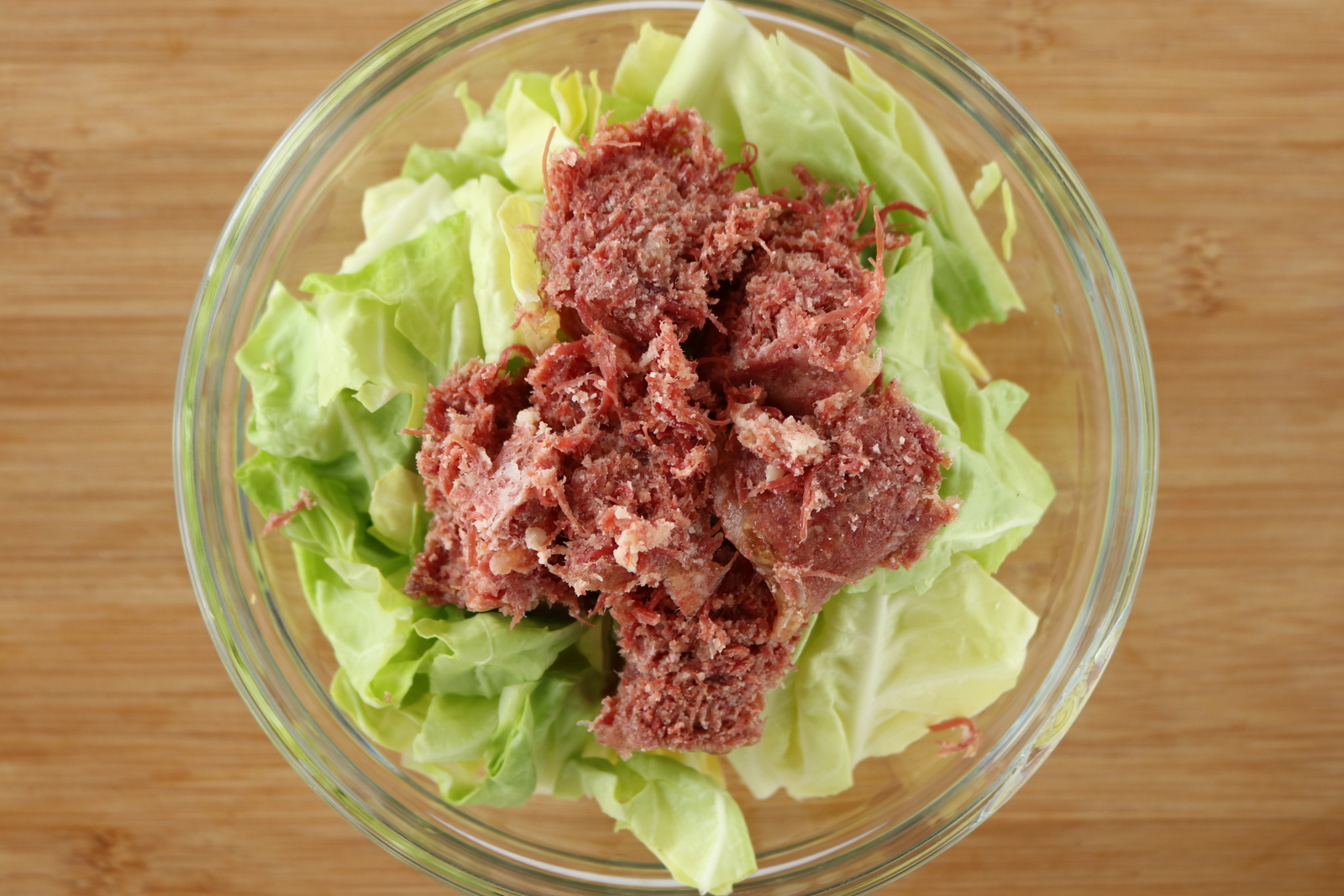 コンビーフをかるくほぐしながらキャベツの上に乗せ、ふんわりとラップをし600wの電子レンジで3分ほど加熱する。