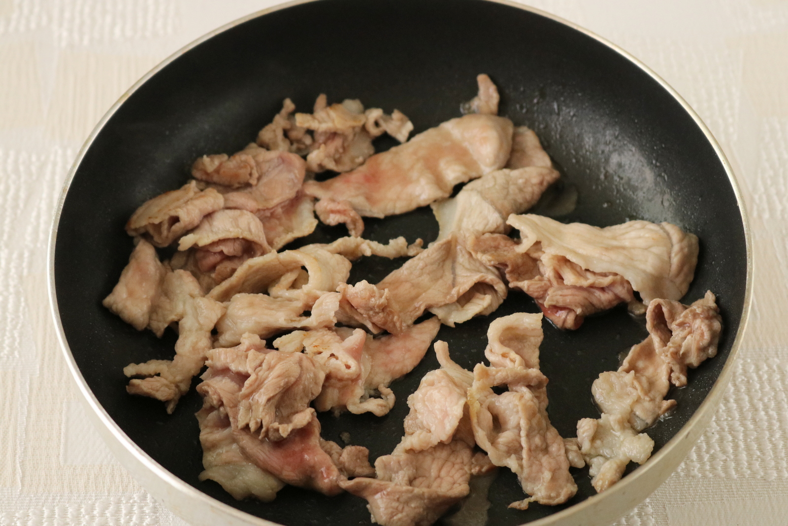 フライパンにオリーブ油を入れ中火にかけ、豚肉の色が変わるまで炒める。