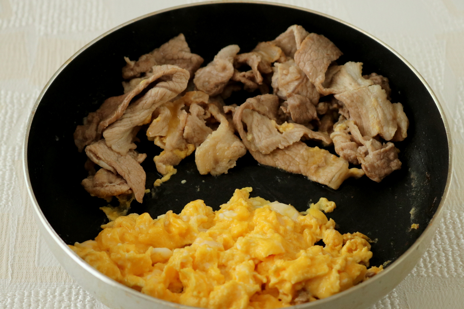 豚肉を端に寄せ、空いたスペースに卵を流し入れスクランブルエッグをつくる。
