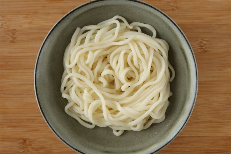 うどんは表示通り流水でほぐし、器に盛る。※茹でるタイプやレンジで解凍するタイプなどお好みの麺を使用してください。