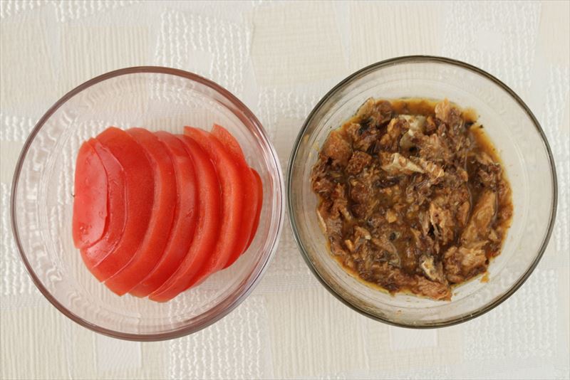 いわしを粗くほぐし缶汁と和える。トマトはスライスする。
