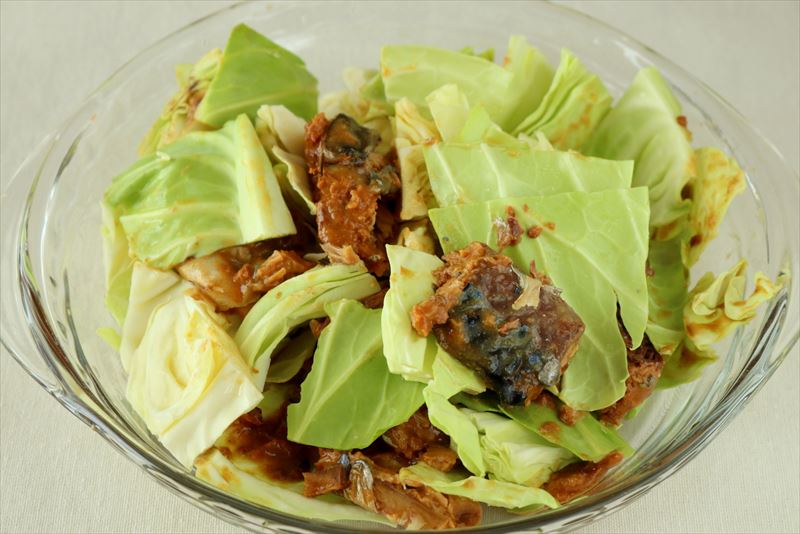 耐熱皿に①と鯖の味噌煮缶を汁ごと加え混ぜ合わせる。ふんわりとラップをして600wの電子レンジで4分ほど加熱する。