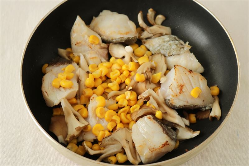 たらに火が通ったらコーンと醤油を入れ全体に絡ませる。