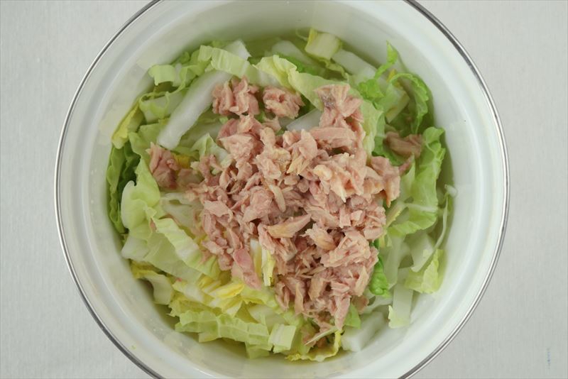 小鍋に白菜、水、ツナ缶を汁ごと加えてふたをし、弱めの中火で5分ほど煮る。