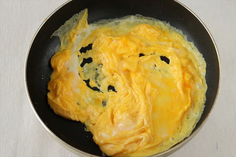 フライパンにオリーブ油を中火で熱し、たまごを流し入れゆっくり、大きくかき混ぜ半熟になったらいったん取り出す。
