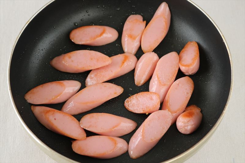 ③のフライパンに魚肉ソーセージを入れ炒め、色づいたらミニトマトを加え炒め合わせる。