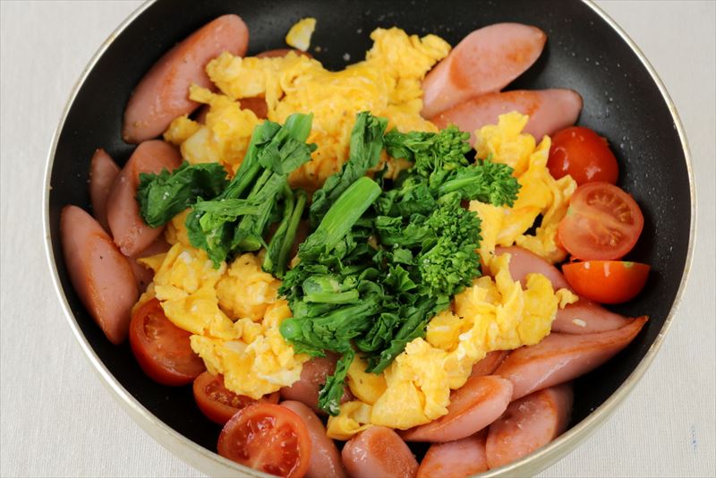 たまごを戻しいれ、菜の花を加え軽く混ぜ合わせ、塩・こしょうで味を整える。