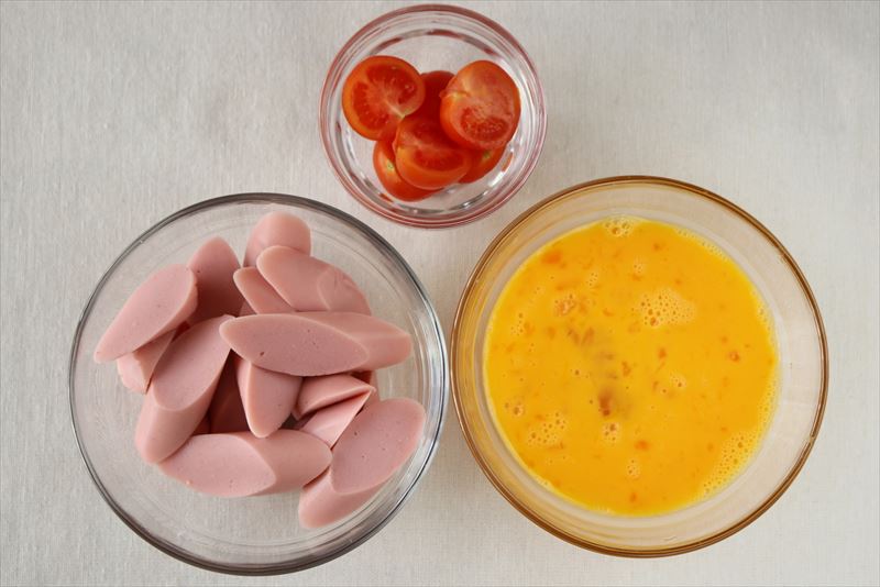魚肉ソーセージは斜め切りにし、ミニトマトは半分に切る。卵は溶きほぐす。