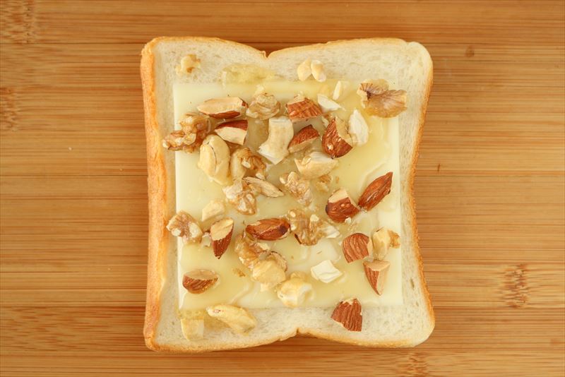 食パンにチーズ、ナッツ、はちみつの順にのせる。