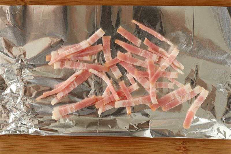 ベーコンは細切りにしてアルミホイルに広げ、トースターで2~3分焼く。