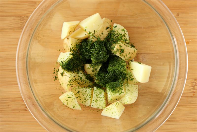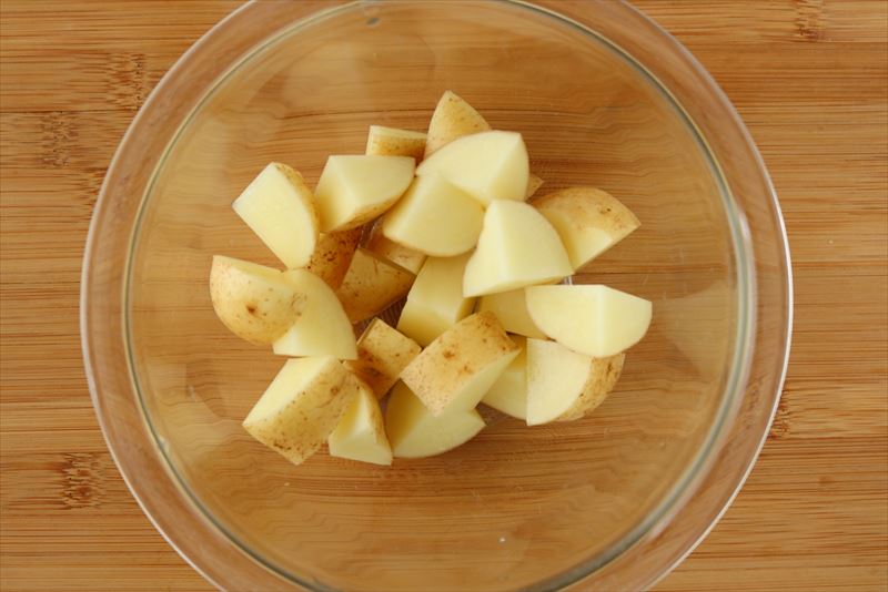 じゃがいもは水洗いし、芽をくり抜き皮はむかずひと口大に切る。耐熱ボウルに入れふんわりとラップをして柔らかくなるまで600wの電子レンジで4分ほど加熱する。