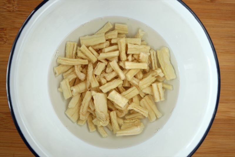 割り干し大根はキッチンはさみで食べやすい長さに切りさっと洗い、ぬるま湯に10分漬ける。