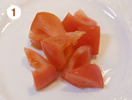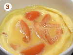 2: | 耐熱容器に卵と牛乳、調味料を溶き、トマトを加えて混ぜる。 | |