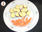 2: | 水気をさっと切ったサツマイモと人参を耐熱容器に入れラップをかけてレンジ(500W)で約2分加熱する。 | |