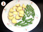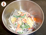 5: | 4に水気をきったサツマイモ、人参、いんげん、ミックスビーンズを加えて和え、器に盛る。 |