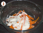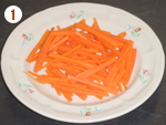 1: | 人参は千切りにする。耐熱容器に入れ、水大さじ1を振ってふんわりとラップをして電子レンジ(600W)で約1分加熱する。ラップをはずして粗熱をとる。くるみは粗く砕いておく。[1] | ||