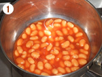 1: | ミニトマトはへたを取って4つ割りにしておく。ベイクドビーンズは鍋で温めておく | |