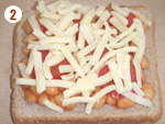 2: | 食パンの上にベイクドビーンズとミニトマト、ピザ用チーズをのせ、オーブントースターでチーズが溶けるまで焼く。 | |