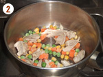 2: | フライパンにオリーブ油を熱し、鶏こま切れ肉とミックスベジタブルを炒める。 | |