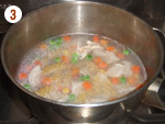 3: | 鶏肉の色が変わったら水2.5カップ、コンソメ、パスタを加える。 | |