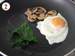 2: | フライパンに油を熱し、目玉焼きをつくる。同じフライパンの空いている部分でマッシュルームとほうれん草を炒める。パンはトーストしておく。 | |