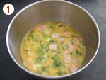 1: | 長ねぎはみじん切りにし、ハムは約1cm四方に切る。ボウルに卵を溶きほぐし、クリームコーン、牛乳、長ねぎ、ハムを加えて混ぜる。[1] | |