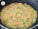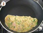 2: | フライパンにオリーブ油を入れてしっかりと熱し、[1]の卵液を一気に流し入れる。 | |