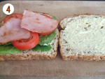 4: | 食パンに[1]を塗る。レタス、トマト、ベーコンの順にのせ、もう1枚のパンではさみ、半分に切る。 | ||