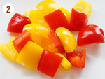 2: | パプリカを2cm角の食べやすい大きさに切る。 | |