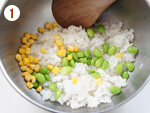 1: | ごはんが温かいうちに、材料を全て混ぜる。 | |