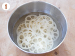 1: | れんこんは3mm程度に薄くスライスし、酢水に2~3分つけてざる上げする。※皮が綺麗な場合はそのまま使いましょう。 | |