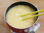 3: | 卵を溶きほぐし、[2]を混ぜながら卵を少しずつ回し入れる。 | |